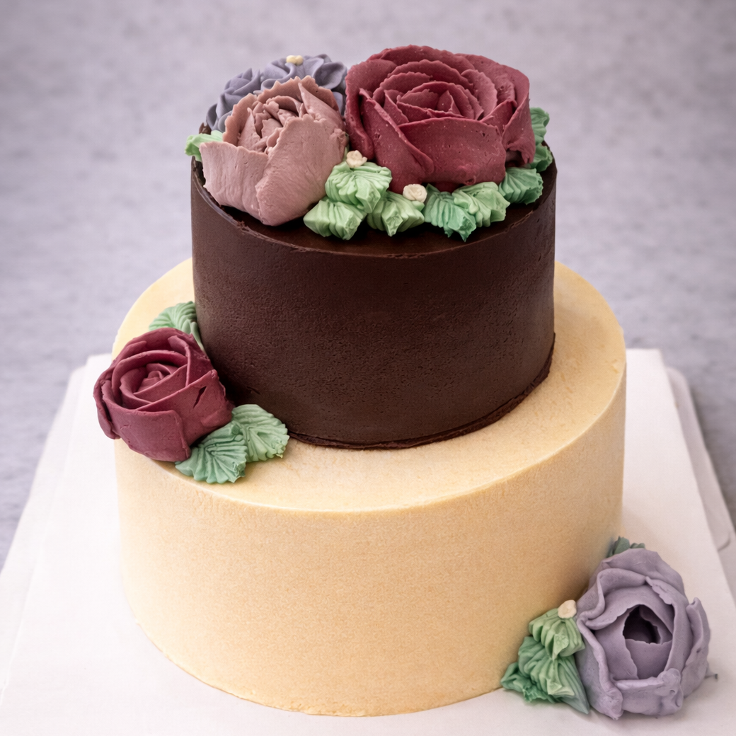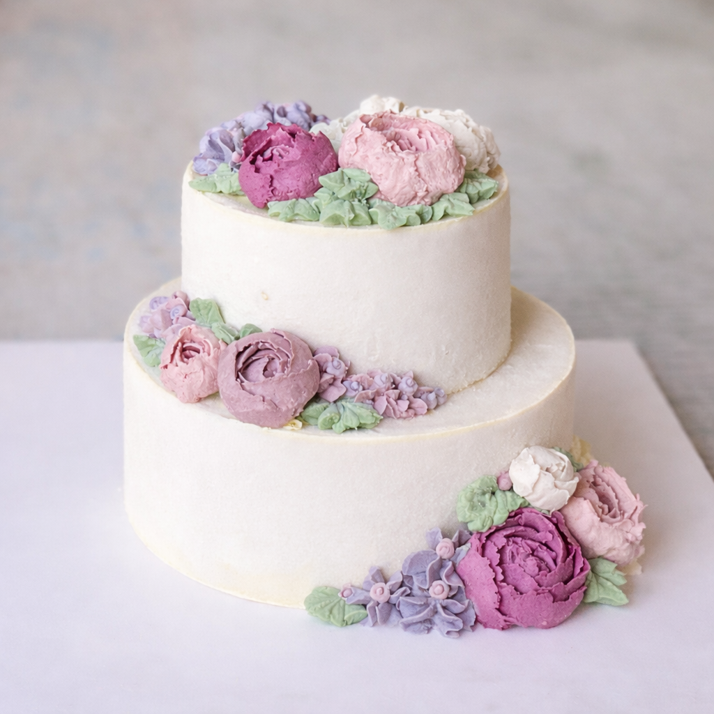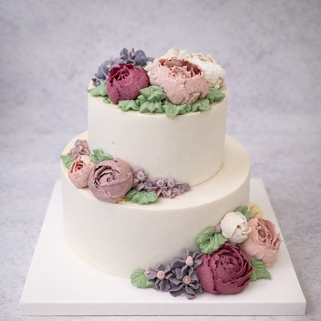 Each cake begins with a considered approach to form, texture, and balance. Botanical elements are hand-piped in varying levels of detail — from restrained finishes to more intricate compositions.